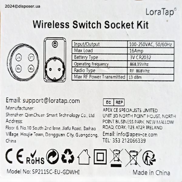 Пусковий пристрій з таймером DISPOSAL WIRELESS SOCKET