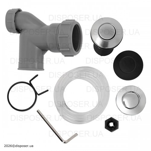 Кнопка пневмовимикача може бути встановлена на стільницю поблизу мийки або прямо на мийку. Необхідний отвір 33мм. Кнопка з'єднується повітряним шлангом з вбудованим в корпус подрібнювача вимикачем. При натисканні на кнопку, повітря по шлангу тисне на вимикач - подрібнювач вмикається. При наступному натисканні - вимикається. Оскільки до пневмокнопки приєднаний тільки повітряний шланг (а не електричні дроти) - Ви абсолютно спокійно можете включати подрібнювач мокрими руками, а також не боятися потрапляння крапель води на кнопку (що неминуче поблизу мийки). Але у будь-якому разі слід остерігатися попадання води безпосередньо в повітряний шланг Фабіано Халк Макс